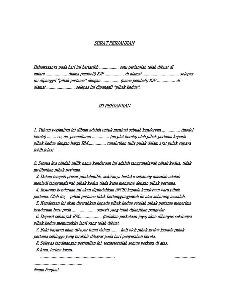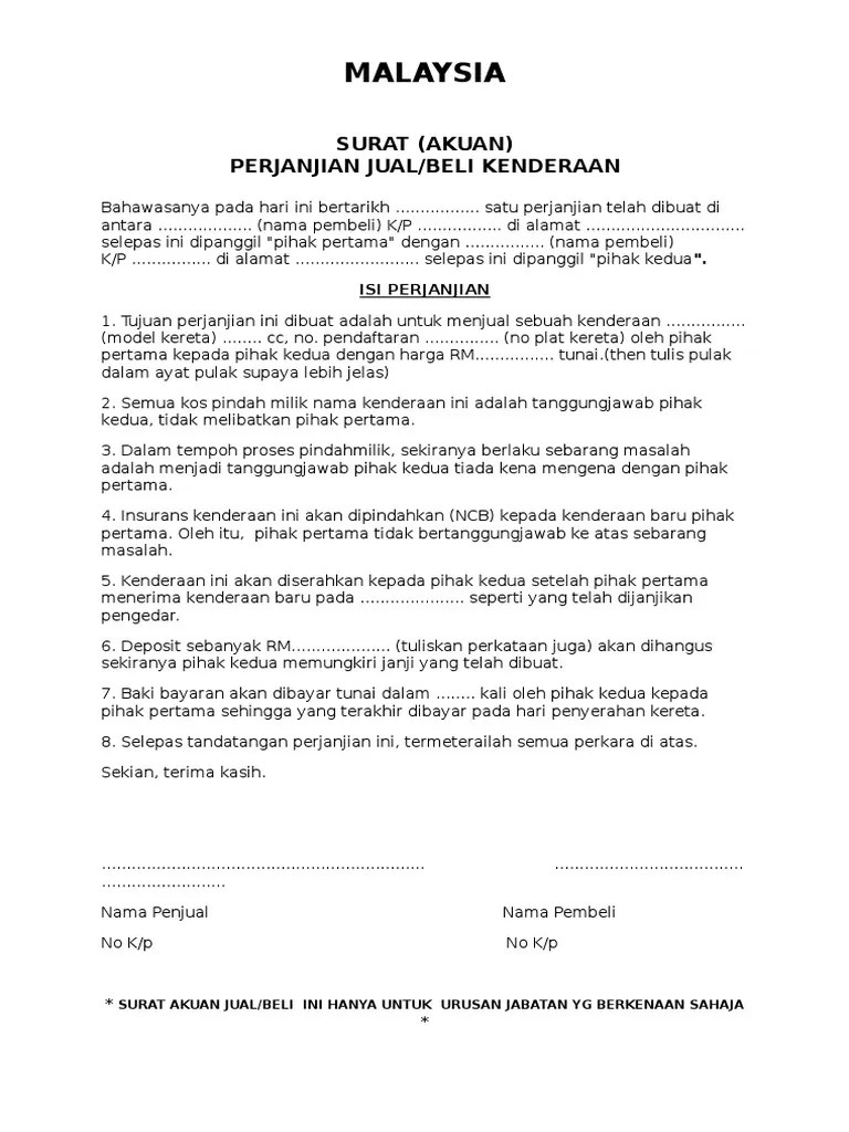 Contoh Perjanjian Jual Beli Kenderaan Download Contoh Perjanjian Jual Beli Kenderaan Download format surat lain. Raya Wangi Teh Melati Km. Pemunya baharu pembeli bagi kenderaan milik persendirian individu hendaklah hadir sendiri untuk membuat pengesahan cap.